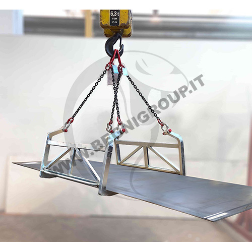 15 April 2025The sheet metal brackets are applied to a 4-arm tie rod and are suitable for lifting bundles or single sheets without the aid of a spreader bar. Bundles of thick sheets can be moved simply and quickly thanks to its great gripping capacity.
